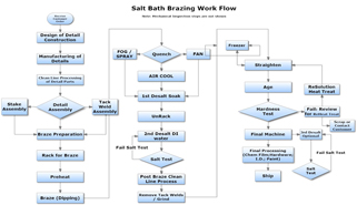 Assemblies are detail designed with considerations to the final applications, service environment, and tolerances required. Individual details are chemically etched to remove surface oxides. These cleaned details are brought into close contact with filler metal typically placed between the individual parts. Assemblies are held in position by various means, including tack welds, self-fixturing such as tab and slot, or hard fixtures. Additional filler can be applied in the form of wire, or paste. Parts are placed on stainless racks and preheated to 985°F in air furnaces, removed and slowly immersed into the salt bath which is controlled to 1098°F, a point above the filler alloy melting point, but below the parent alloy. After the appropriate time, typically a few minutes, the fixture with the parts are removed and quenched, (cooled rapidly) usually with forced air or a spray fog of air and water to allow redevelopment of the mechanical properties with the minimum of distortion. Parts are cleaned of residual fluxes, straightened, and precipitation hardened (aged) for 8 hours at 350°F during which mechanical properties of the parent material are maximized. Tack welds if used as a fixturing method, and any residual braze filler are ground off in a manual operation. Assemblies requiring close tolerances are typically designed with final machining stock left in the required areas and cnc machined to requirements.